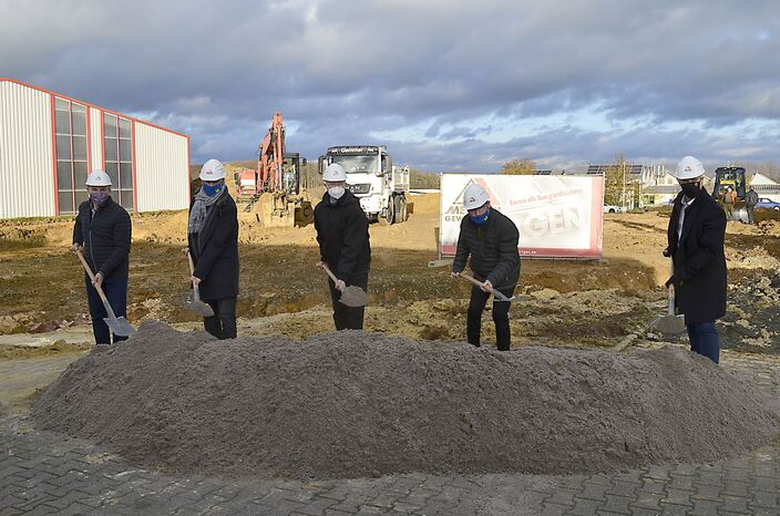 It is done, after careful analysis and preparation Mr. Hübinger (technical manager Ridder), Busch-Ridder (managing director Ridder), District Administrator Puchtler, Mayor Paul and Marc Ridder (Managing Director Ridder) for the symbolic groundbreaking of the new warehouse.