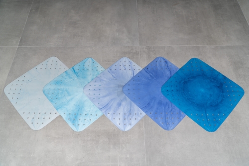 The unique mats are available in small editions at badshop24 as long as stocks last. Unfortunately, only a small selection of the available colour gradients can be shown in the pictures, as each inlay is unique and cannot be duplicated. From dark red to black colour tones to the most varied shades of blue, which could be a sky shot, to glaring splashes of pink, everything is possible and nothing is improbable.