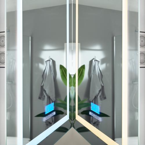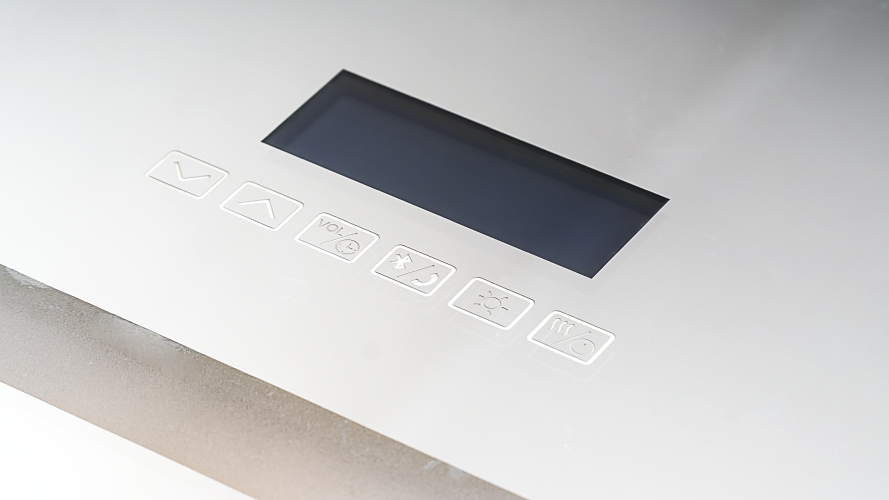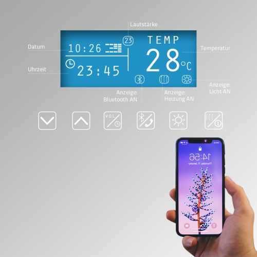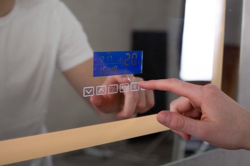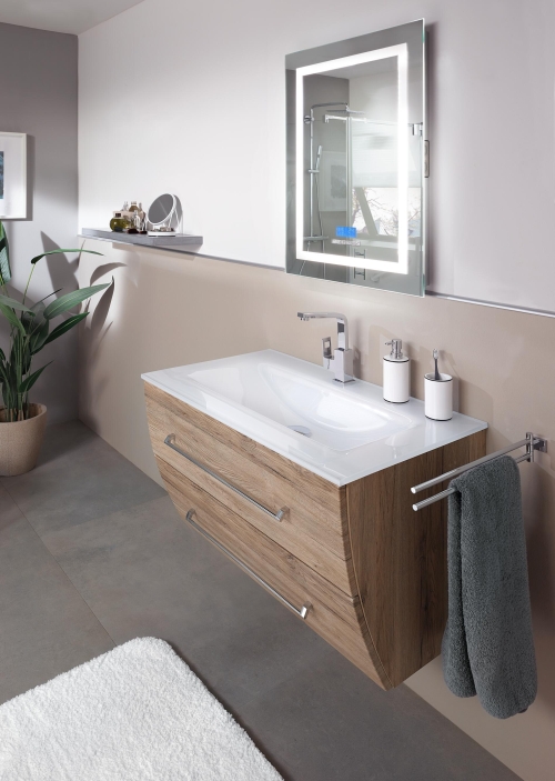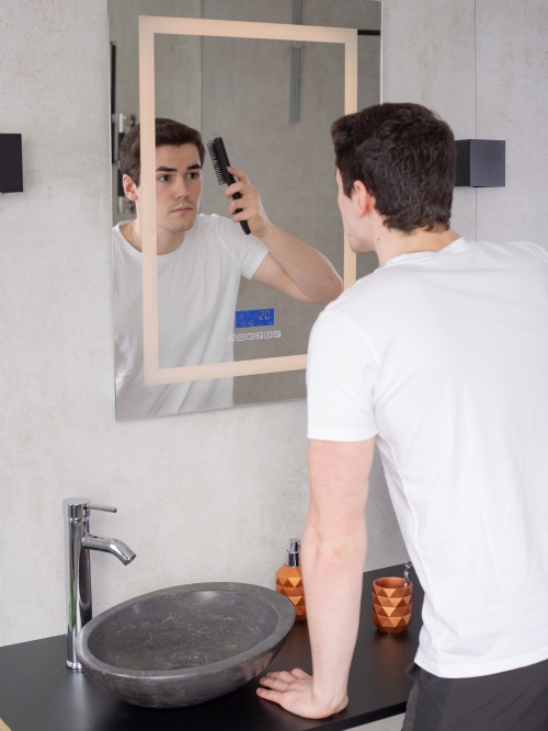 Of course, the illuminated display also shows the time and temperature. And so that you don't have to wipe the steam off the mirror surface after showering, the mirror itself can be heated (anti-fog technology) and is immediately ready to help you with your styling.