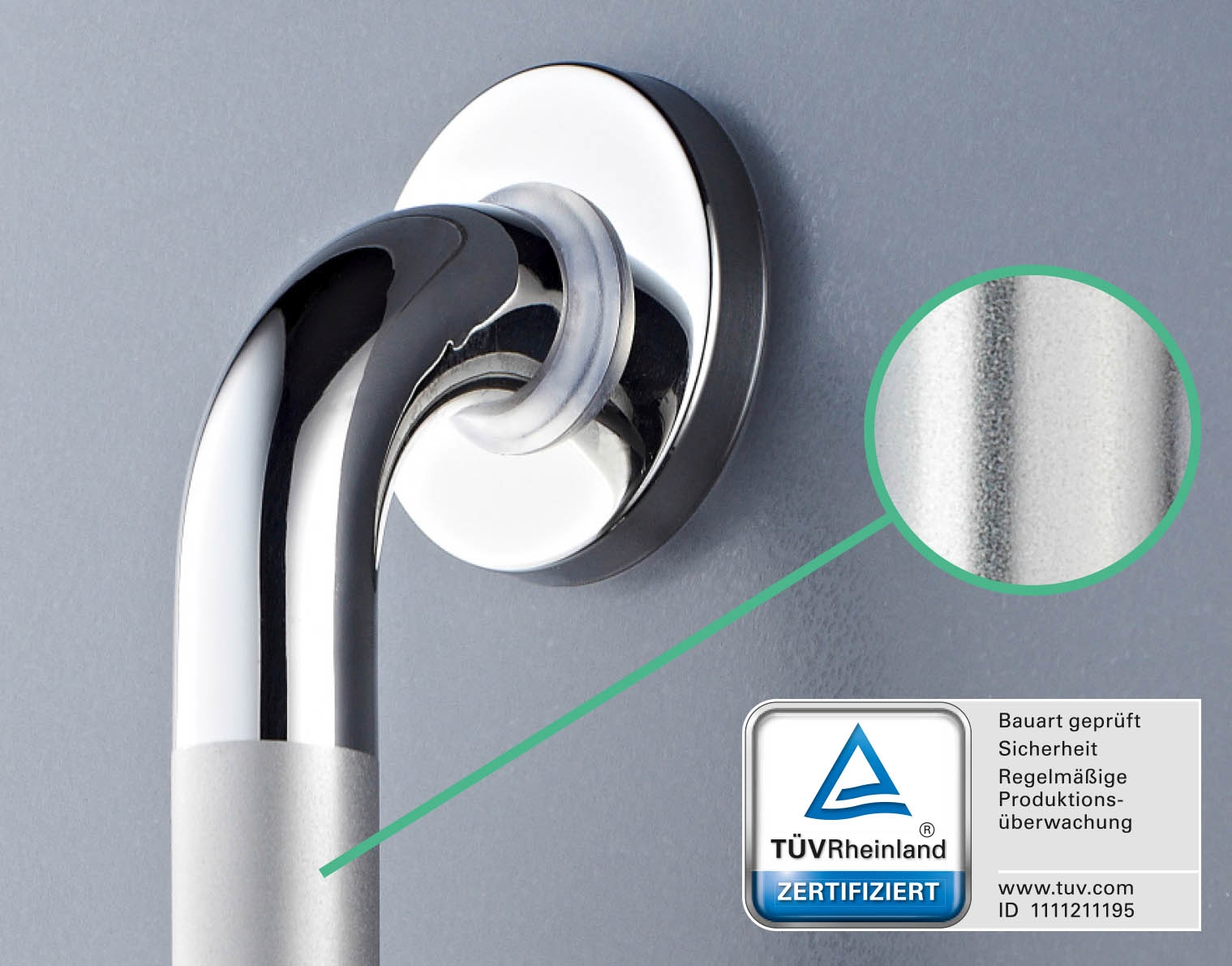 Smooth tiles quickly get dangerous, especially in combination with water and soap residues they can become extremely slippery. Our grab bars ensure secure hold and help to avoid accidents in the bathroom. The most common places where grab bars are fixed are in the shower or bathtub next to the sink or next to the toilet – simply everywhere where extra hold is required. We offer different colours and materials: white (aluminium) or matt or shiny chrome made of stainless steel. Each grab bar is available in three different sizes: S, M, L. Our grab bars can be fixed in two ways: with screws or with our our strong mounting glue Fix & Clean.