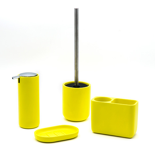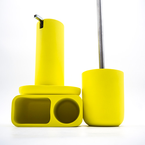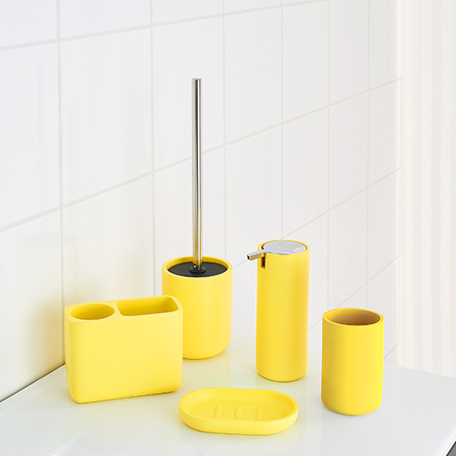 The practical accessories are made of polyresine and can be easily cleaned in the dishwasher if necessary. Available in the colours beige, yellow and rosé, the accessories impress with their fresh look and flexibility. For example, you can use the soap dish as a storage place for rings, hair ties, hairpins, paper clips or coins.