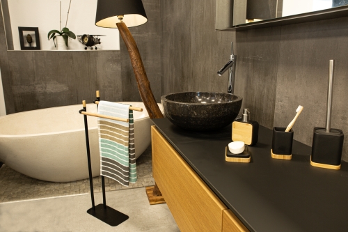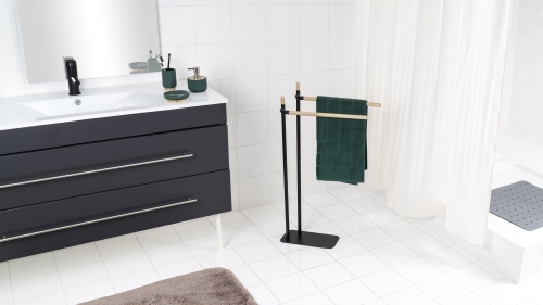 Seinen besonderen Charme erhält der Handtuchhalter, genau wie sein passendes Gegenstück die WC-Stand-Garnitur, dabei durch die schicken und zugleich nachhaltigen Bambus-Elemente.